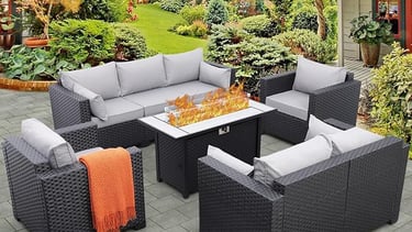 Rattaner 5 Pcs Outdoor Furniture Sets Patio Furniture Set with 45" Fire Pit Patio Couch Outdoor Chairs 60000 BTU Steel Propane Fire Pit Table No-Slip Cushions and Waterproof Covers, Light Grey