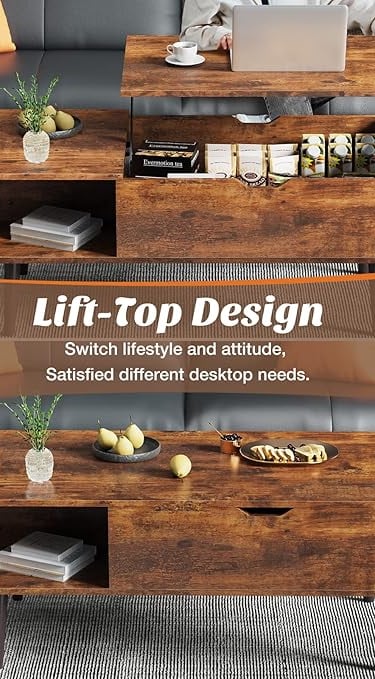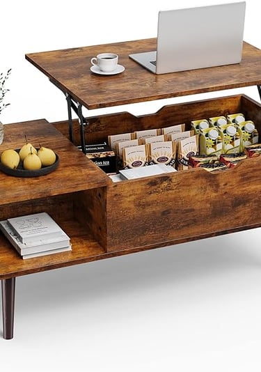 Sweetcrispy Coffee Table, Lift Top Coffee Tables for Living Room, Small Rising Wooden Dining Center Tables with Storage Shelf and Hidden Compartment, Brown